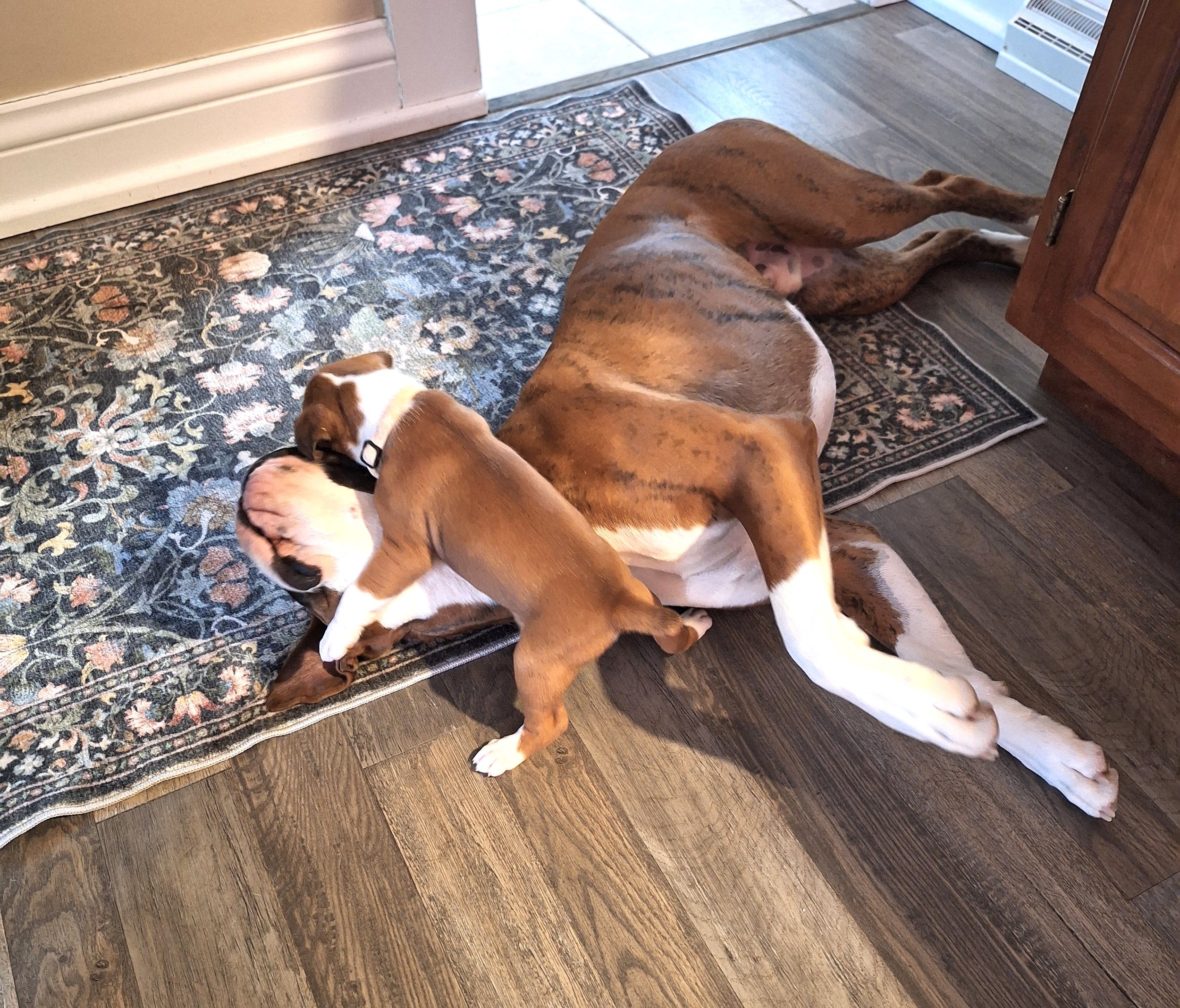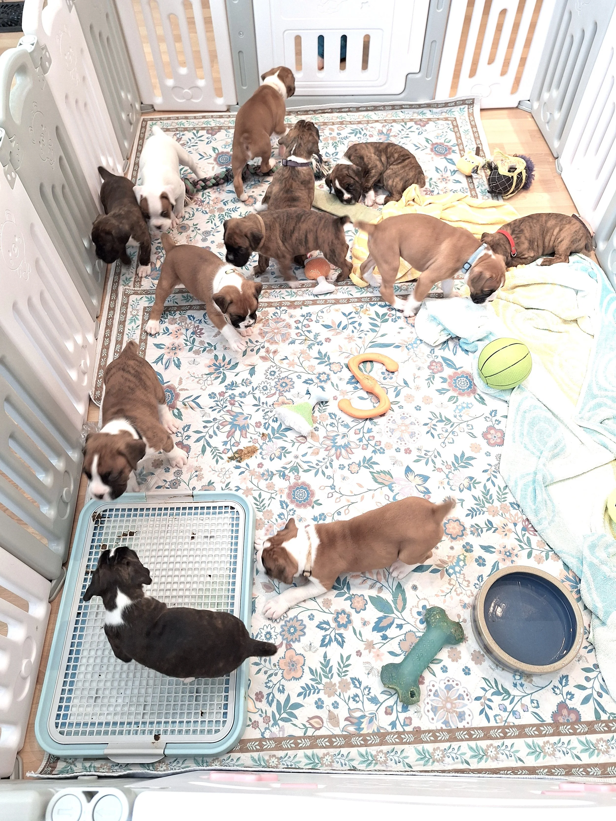 Your AKC Boxer puppy receives preparation for family life through daily handling, early neurological stimulation, and socialization. Supervised play, household sounds, and interaction with different people, develops well-adjusted puppies comfortable in family settings. By the time your Puppy is ready for placement, we can provide detailed information about each puppy’s temperament, preferences, and readiness for successful transition to your family.