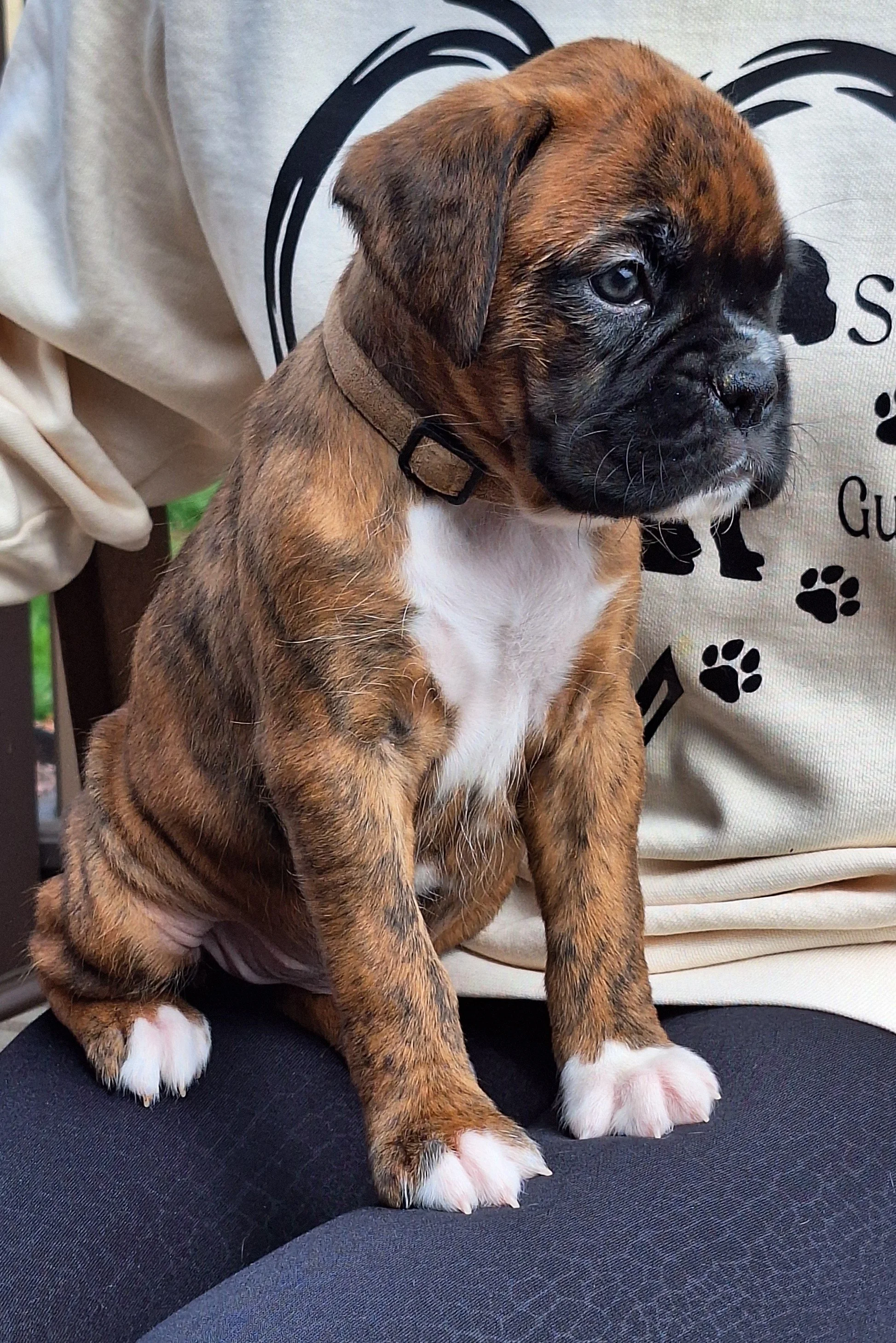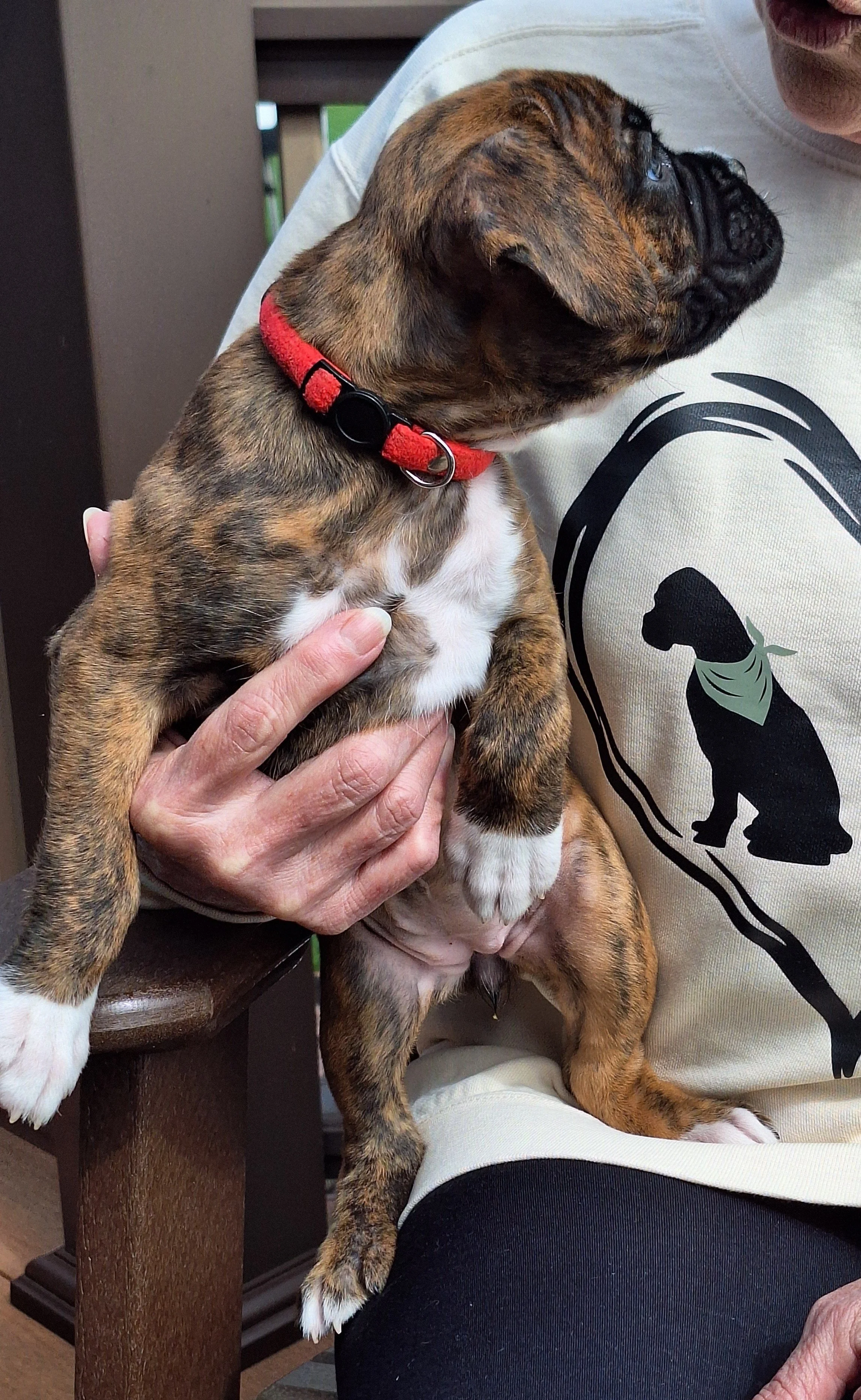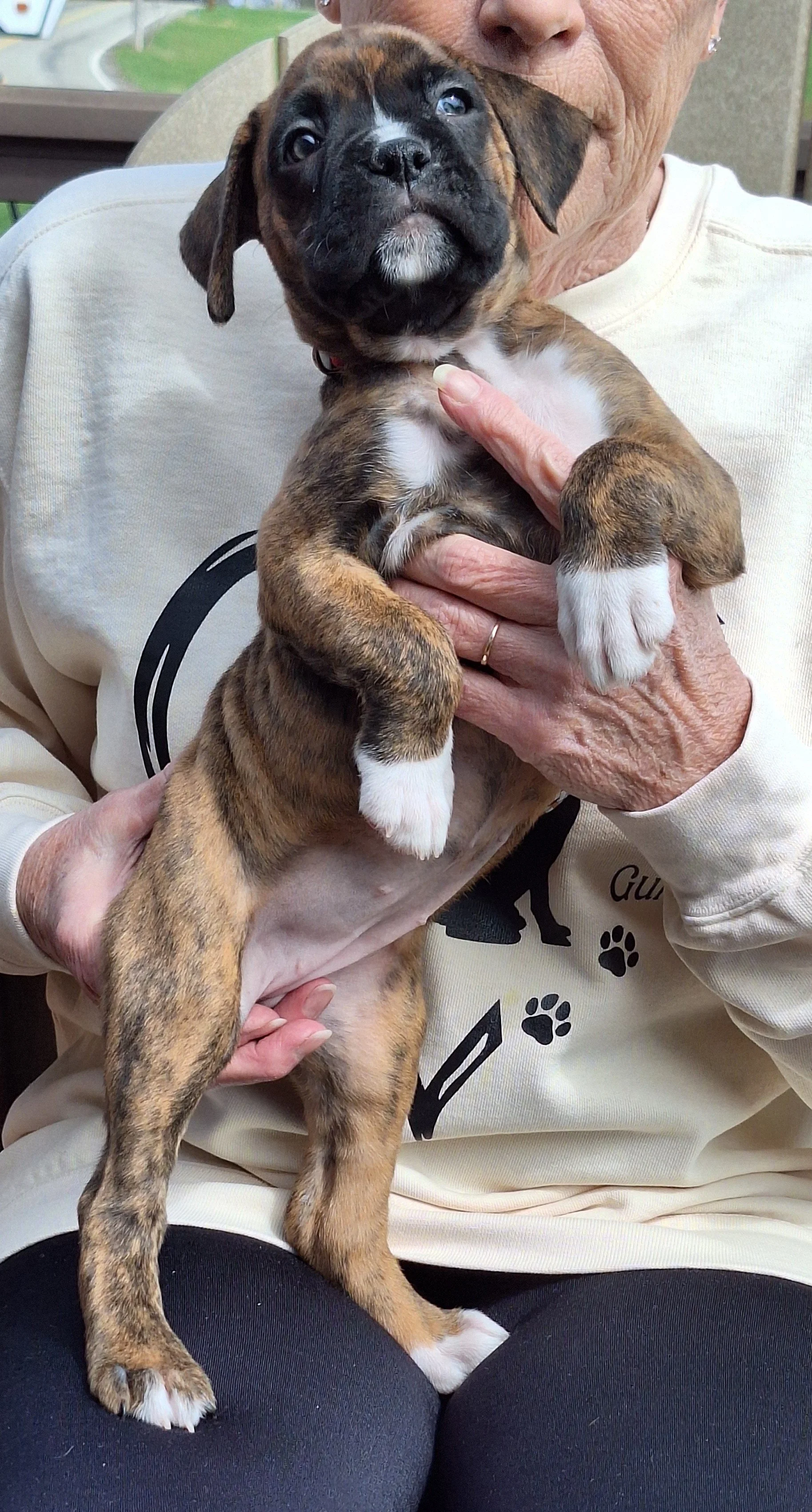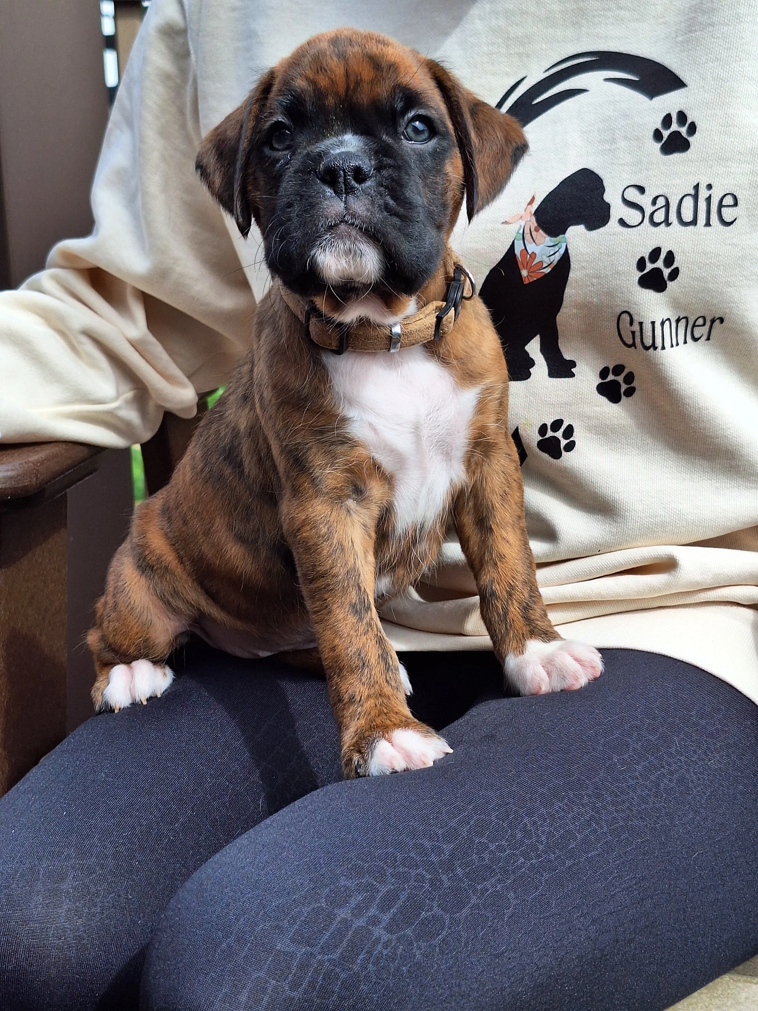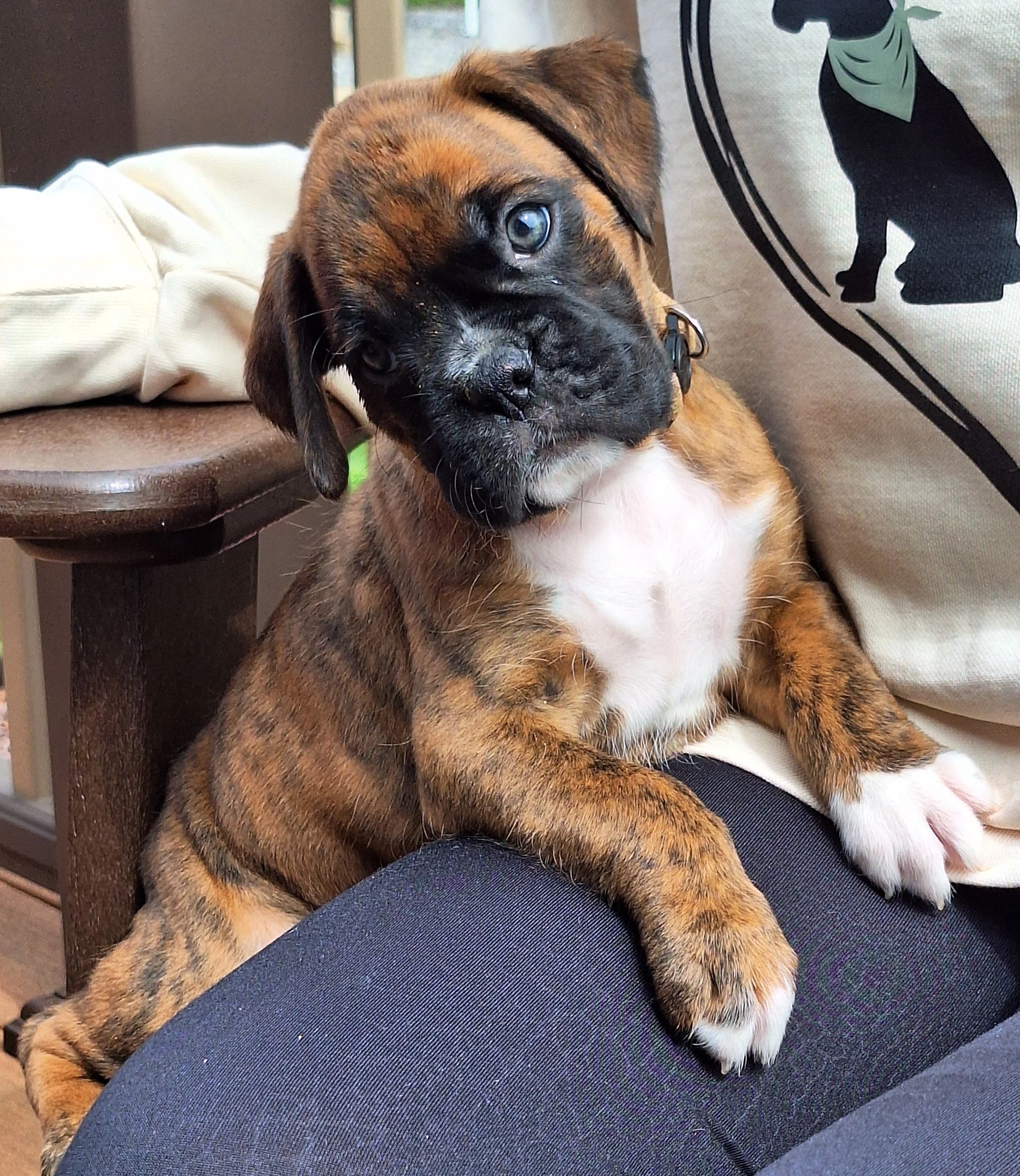 Gunner is a beautifully and well-Marked Mahogany Brindle with four white paws and two white hocks. Gunner has an exceptional constitution and a wonderful head. His Muzzle is square with a great underbite. Gunner is a typical Boxer, inquisitive, strong, very intelligent, always on the move and loves the Frisbee. Gunner goes with me everywhere and loves everybody. Gunner is a great companion and protector. Gunner weighs 75Lbs and stands 23.5” at the shoulders. Gunner was born January 9, 2025, and joined our family in March of 2025. Gunner is still a teenager, and I expect him to top out at the top of the AKC Standard for weight and overall size.