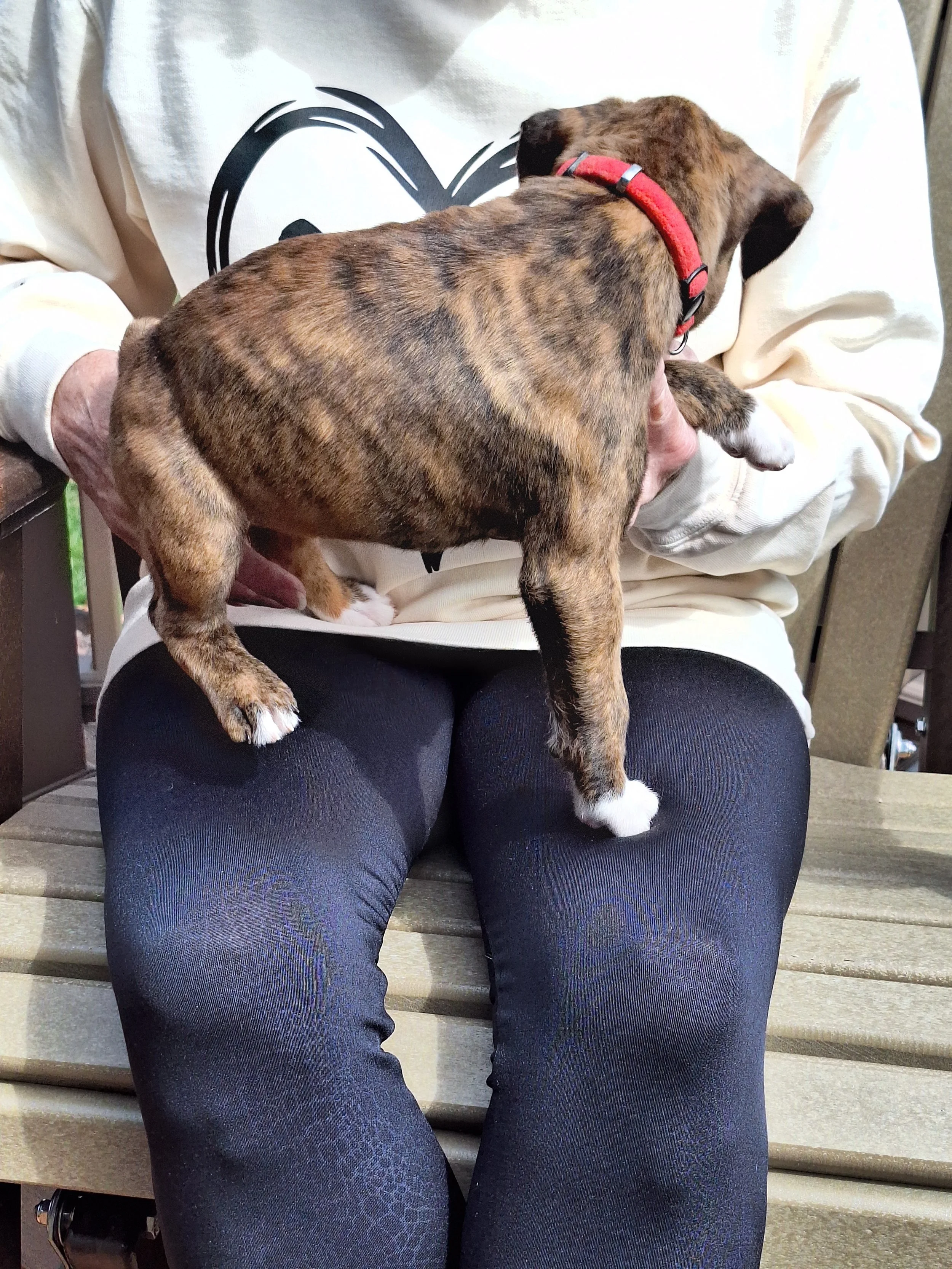 Sadie is a beautifully and well-Marked Mahogany Brindle with a full one third white including four white hocks. Sadie has an exceptional head, great square muzzle and wonderful eyes. She is very gentle, a great companion and protective. Sadie weighs 74Lbs and stands 23” at the shoulders. Sadie was born February 8, 2024, and joined or family in June of 2024.
